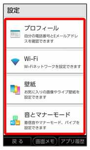 | 音とマナーモード | 着信音、操作音など、音に関する設定ができます。 | |