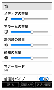 | メディアの音量 | 音楽や動画などの音量を設定します。 | |