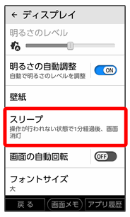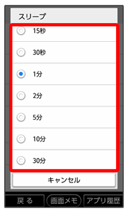 | スリープ | 一定時間操作をしなかったときに、画面が自動消灯するまでの時間を設定します。 | |