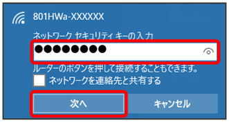 - パソコンの共有についての確認メッセージが表示される場合がありますが、ここでは設定しません。パソコンの共有については、Windowsのヘルプを参照してください。
