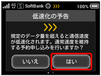 通信速度の低速化を予告するポップアップ画面が表示された場合に、低速化解除の予約のお申し込みができます。