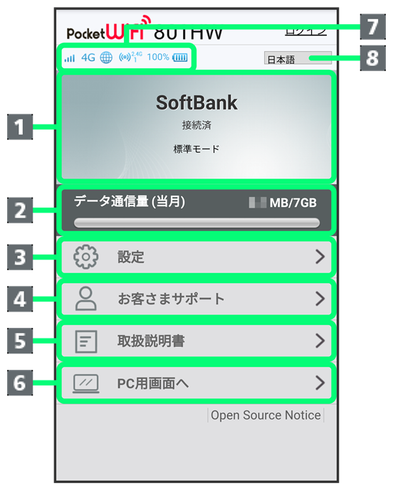 ・ソフトウェア更新通知 ・お知らせ ・モバイルネットワーク受信レベル ・ネットワークの種類 ・Wi-Fiスポット ・インターネット接続状態表示 ・無線LAN状態表示 Wi-Fi通信規格(2.4G/5G)の下に表示される数字は、現在、本機に接続されている無線LAN端末数です。 ・電池残量表示 |