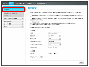 Wi-Fi名(SSID B)について無線LANの基本的な設定を行います。