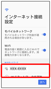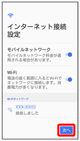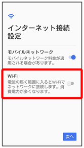 - Wi-Fi設定を省略するときは、次へをタップし、手順