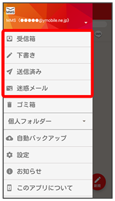 - 受信箱/下書き/送信済み/ゴミ箱/迷惑メール
