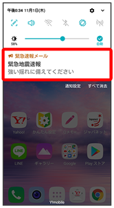 とメッセージが表示され、緊急地震速報/災害・避難情報個別の警告音およびバイブレータでお知らせします。
