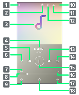 - カバーアート:曲がアルバムに登録されている場合は、そのアルバムに登録されている画像が表示されます。また、左右にフリック/スワイプして前後の曲を再生したり、タップして歌詞を表示したり、ロングタッチして曲やアーティスト、アルバムを検索できます。