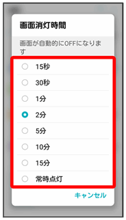 | 画面消灯時間 | 一定時間操作をしなかったときに、画面が自動消灯するまでの時間を設定します。 | |