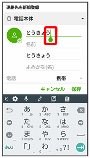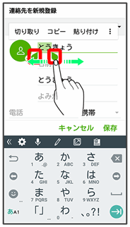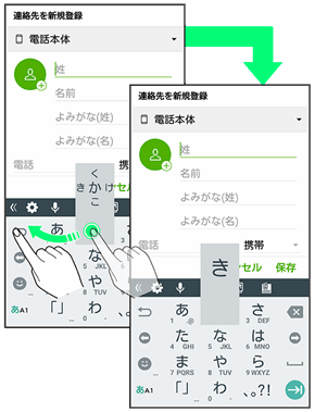 10キーキーボードで入力するとき、キーを上下左右にフリックすることで、キーを繰り返しタップすることなく、入力したい文字を入力できます。キーに触れると、フリック入力で入力できる候補が表示されます。入力したい文字が表示されている方向にフリックすると、文字が入力されます。