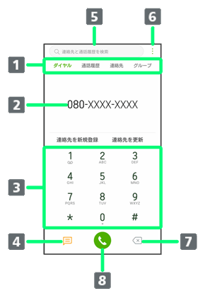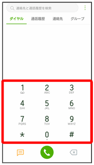 電話をかけます。また、発信履歴がある場合、電話番号未入力のときにタップすると最新の発信履歴が入力されます。