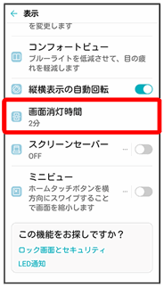 | 画面消灯時間 | 一定時間操作をしなかったときに、画面が自動消灯するまでの時間を設定します。 | |