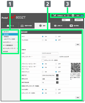 | 受信レベルのアイコン: モバイルネットワークの受信レベルをアイコンで表示します。 ネットワークオペレーター表示: 接続中のネットワークオペレーター名を表示します。 ネットワークの種類: 4G/LTE/3Gのいずれかを表示します。 ネットワークモード: 利用中のネットワークモードを表示します。 通信時間: 接続してから現在までの通信時間を表示します。 データ通信量: 接続してから現在までの送信/受信データ通信量を表示します。 接続ボタン: ネットワークへの自動接続が失敗した場合に、手動で接続します。 SSID A: Wi-Fi名(SSID A)に接続中の機器の端末名を表示します。 SSID B: Wi-Fi名(SSID B)に接続中の機器の端末名を表示します。マルチSSID機能(SSID B)がONの場合にのみ表示されます。 |