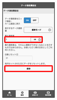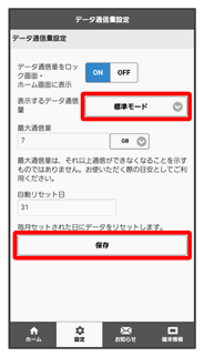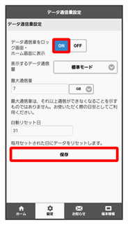 モバイルネットワークのデータ通信量を本機のホーム画面に表示するかどうかの設定や、データ通信量の最大通信量と通信量をリセットする日の設定ができます。