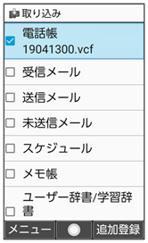 ほかの機器や本機でSDカードに保存したデータ(電話帳、メール、スケジュール、メモ帳、ユーザー辞書/学習辞書)を、本機に取り込むことができます。
