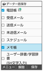 本機の電話帳、メール、スケジュール、メモ帳、ユーザー辞書/学習辞書のデータをSDカードに保存することができます。