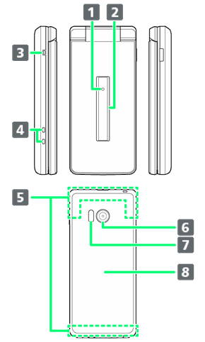 | 通話時、インターネット利用時などに使用します。感度に影響しますので、シールなどを貼ったり手で覆ったりしないでください。 | ||