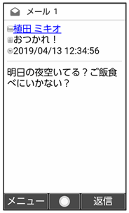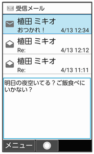 迷惑メール設定を行うと、電話帳に登録していない差出人から受信したメールは、新着メール通知されず、迷惑メールフォルダに保存されます。迷惑メールフォルダに保存されたメールは、次の操作で確認できます。