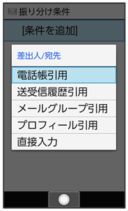 迷惑メール設定が無効のときは、以下の動作で振り分け条件が設定され、電話帳に登録していない差出人からのメールが振り分けられるようになります。