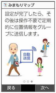 - お使いのスマートフォンに「みまもりマップ」アプリをインストールし、アプリの「グループ管理機能」で本機をグループに登録する必要があります。「グループ管理機能」のご利用には、「スマートフォン基本パック-S」または「位置ナビ」にご加入いただく必要があります。