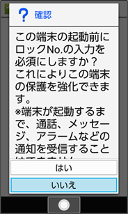 - 画面ロックを設定した場合に、起動時に入力を必須としたときは、本機を起動するときにロックNo./パスワードを入力する必要があります。このとき、入力を10回および20回連続して間違えたときは、本機を再起動してから再度入力する必要があります。30回連続して間違えると、本機が初期化されますので、ご注意ください。