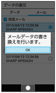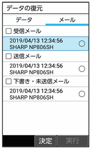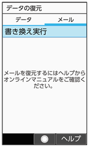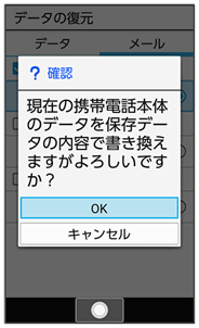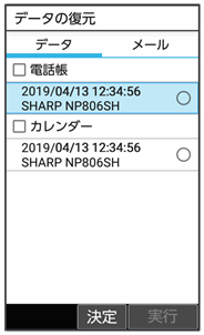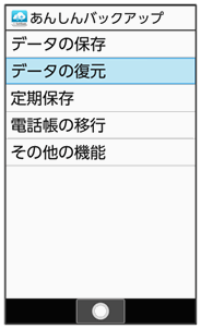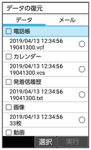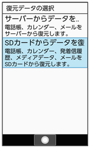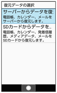サーバー/SDカードなどに保存した電話帳データ/カレンダーデータ/発着信履歴データ/画像データ/音楽データ/動画データから、データを選択して本体に復元することができます。