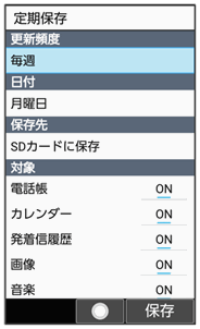 本体の電話帳データ/カレンダーデータ/発着信履歴データ/画像データ/音楽データ/動画データを、サーバー/SDカードなどに定期的に自動で保存します。