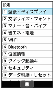 | 待受画面・壁紙 | 待受画面の壁紙や表示内容を設定します。 詳しくは、「待受画面の画像を変更する」を参照してください。 |