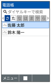 (詳細)を押すと、その他の項目も表示します。 - 電話帳画面で検索ワードを入力すると、電話帳の絞り込み検索ができます。名前(よみがなを含む)/電話番号/Eメールアドレスなどの項目が検索対象となります。
