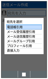 • 電話帳引用メール受信履歴引用メール送信履歴引用と操作すると、電話帳/メール受信履歴/メール送信履歴から宛先を選択できます。