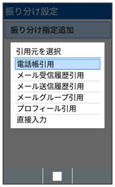 - 電話帳引用/メール受信履歴引用/メール送信履歴引用/メールグループ引用/プロフィール引用/直接入力