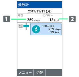 1日の歩数や歩行距離、消費カロリーなどを記録したり、確認したりすることができます。