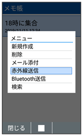 相手機器やデータによっては、利用できなかったり、正しく転送されなかったりすることがあります。また、赤外線通信中に、ほかのアプリが起動すると通信が終了します。