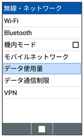 - モバイルデータ使用と操作すると、モバイルデータ使用画面が、表示されます。
