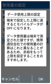 が表示され、上限になるとモバイルデータ通信を無効にした案内が表示されます。このときは、画面に従って操作してください。