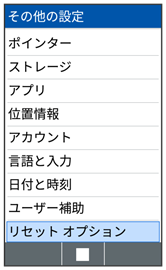 | リセット オプション | 各種設定のリセットや、すべてのデータの消去(初期状態にリセット)が行えます。 |
