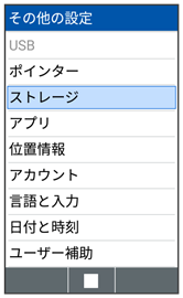 | ストレージ | 本体メモリ/SDカードの容量の確認や、SDカードのマウント、SDカード内のデータを消去できます。 | |