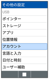 | アカウント | アカウントの追加ができます。また、追加したアカウントの同期について設定できます。 | |
