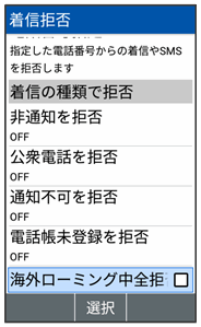 海外ローミング時は「海外ローミング中全拒否」以外の着信拒否設定は無効になります。