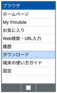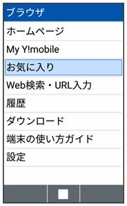 ブラウザメニューからインターネットに接続したり、接続履歴やダウンロードしたデータの確認、設定などができます。ブラウザメニューには次の項目があります。