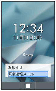 緊急速報メールの受信画面が表示され、緊急地震速報用警告音/災害・避難情報、津波警報用警告音、バイブレータおよび着信LEDでお知らせします。