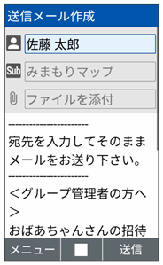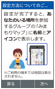 - お使いのスマートフォンに「みまもりマップ」アプリをインストールし、アプリの「グループ管理機能」で本機をグループに登録する必要があります。「グループ管理機能」のご利用には、「スマートフォン基本パック-S」または「位置ナビ」にご加入いただく必要があります。
