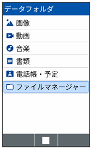 本機のデータはデータフォルダで管理されています。各アプリでデータを作成したり、メールやインターネットでデータを入手すると、自動的に該当するフォルダへ保存されます。