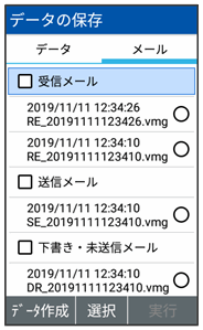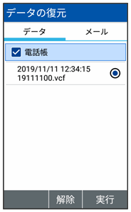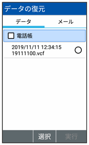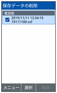 保存したデータのファイル名は保存年月日になります。たとえば、2019年11月11日に保存された電話帳ファイルは、「19111100.vcf」となります。同じ日に複数のファイルを保存した場合は「19111101.vcf」となり、下2桁の数字が増えていきます。