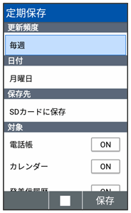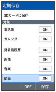 本体の電話帳データ/カレンダーデータ/発着信履歴データ/画像データ/音楽データ/動画データを、サーバー/SDカードなどに定期的に自動で保存します。