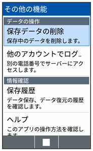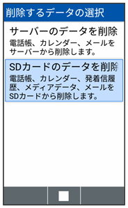 サーバー/SDカードなどに保存した電話帳データ/カレンダーデータ/発着信履歴データ/画像データ/音楽データ/動画データ/メールデータを削除します。