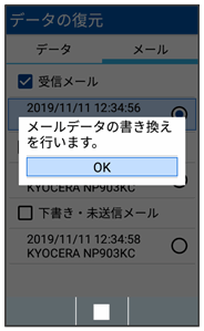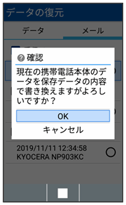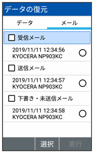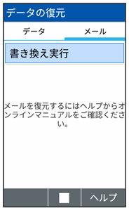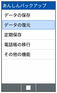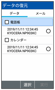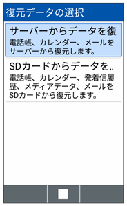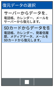 サーバー/SDカードなどに保存した電話帳データ/カレンダーデータ/発着信履歴データ/画像データ/音楽データ/動画データから、データを選択して本体に復元することができます。