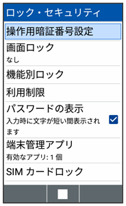 画面ロックや暗証番号など、セキュリティに関する機能を設定できます。設定できる項目は次のとおりです。