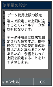 あらかじめ、データ使用量の上限と警告位置を設定しておけば、使用中に上限に近づくと、警告や制限案内を表示させることができます。