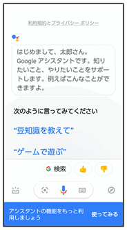 音声検索や機能の起動以外にも、今日の天気や予定を確認したり、マップ機能と連携して、近くのお店を探したりできます。詳しくは、Googleアシスタント画面でをタップすると表示される「使い方・ヒント」をご参照ください。