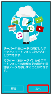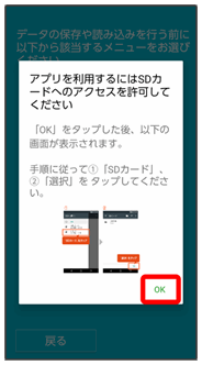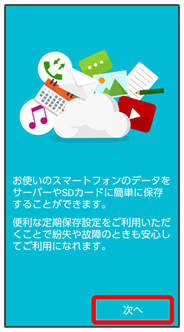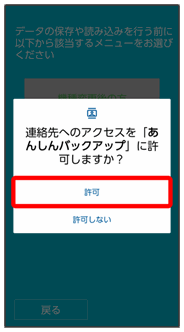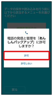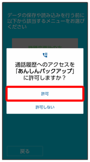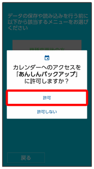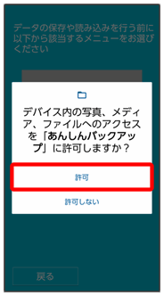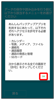 あんしんバックアップをはじめて起動したときは、あんしんバックアップについての説明画面が表示されます。画面に従い、各種データを保存するために許可の設定を行います。